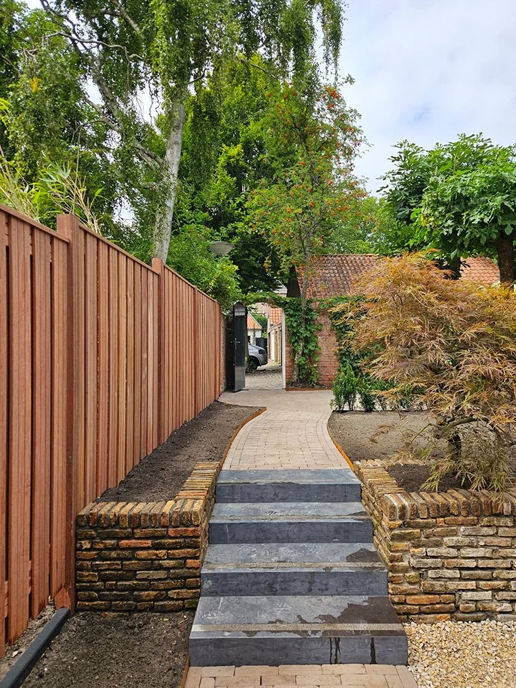 Deze tuin is getransformeerd van een wildernis naar een mooie stadstuin die past bij de stijl van het huis. We hebben samen met de klant gekozen voor mooie gebakken waaltjes in combinatie met grind, cortenstaal en een hardhouten schutting.